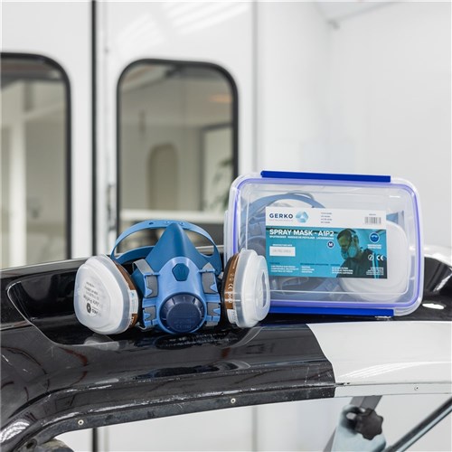 Spray mask that protects against inhalation of isocyanates, from paint or solvents. The mask fits snugly around nose and mouth. This PPE is designed to protect against hazards that can cause irreparable damage to health. Each mask comes in an airtight storage box with two A1 carbon filters and two P2 pre-filters. Replacement is necessary after a period of use of up to 40 hours. Complies with the UNE-EN 140 standard and is CE-certified under number 0159.