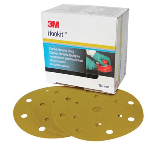 The 3M™ Hookit™ Gold Disc 236U is used for auto body sanding projects on materials like fiberglass, filler, metal, paint, plastic, and putty, offering coarse to medium grade sanding. It features an open coat construction with aluminium oxide mineral abrasive for a sharp, aggressive cut while minimizing dust accumulation. The design allows effective dust evacuation, preventing clogging, and includes a load-resistant coating to enhance cutting performance. Available in various sizes with a durable C-weight paper backing, the disc is ideal for paint removal, rough feather-edging, and scratch refinement. The multi-hole pattern on select versions aids dust removal, and the Hookit™ attachment system provides secure, reusable connections on hook-and-loop backup pads.