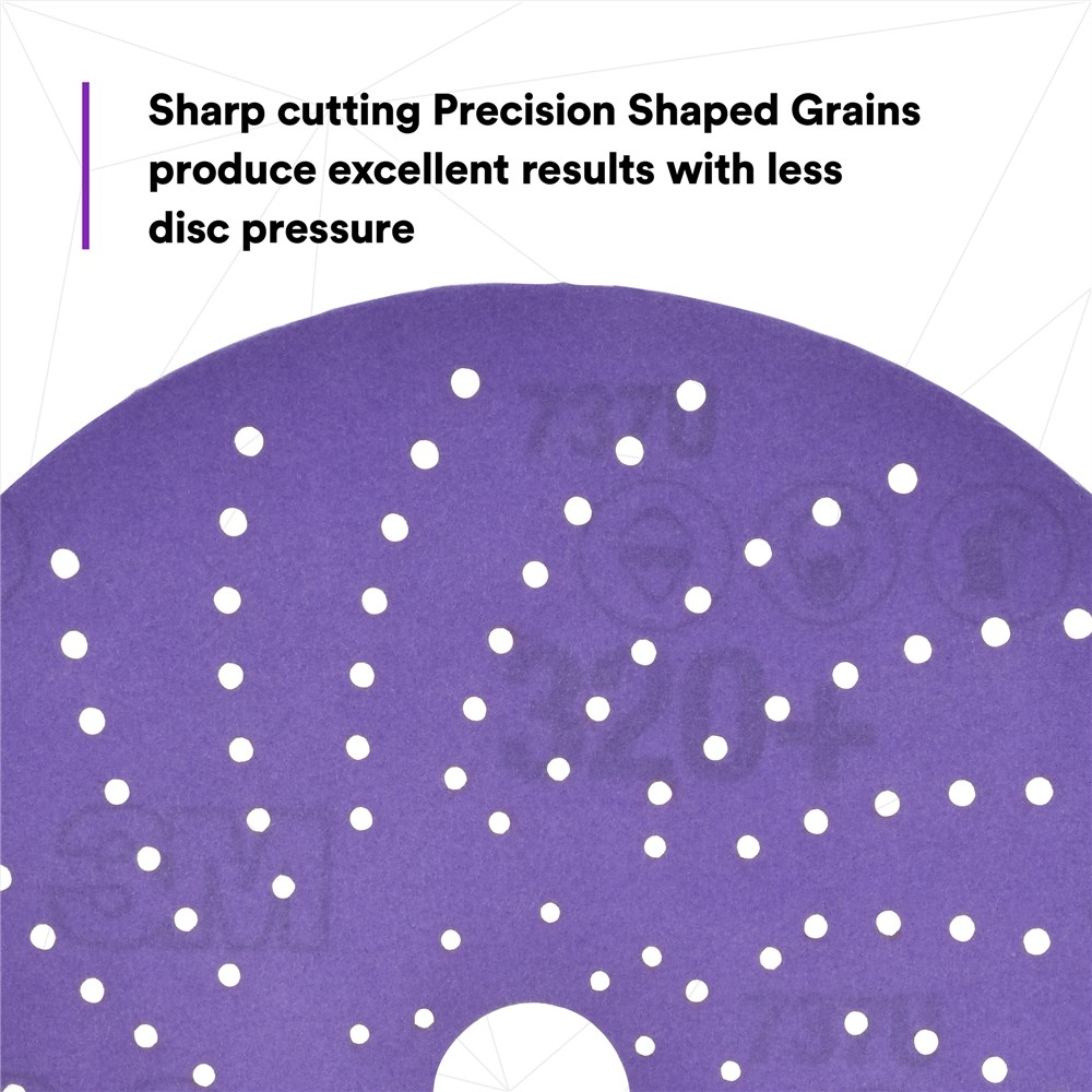 3M Cubitron II Hookit Clean Sanding Abrasive Disc 737U combines the highest 3M technology for automotive repair. Its long-lasting triangular shaped grain and multi-hole pattern for superior dust extraction allow for a long disc life. The wide range of available grades offer discs for coarse body work up to fine sanding of blending areas. The 3M Hookit system makes for quick disc change-outs. This disc is perfect for removing paint, shaping body filler, fine feather-edging, final prep before priming, or even surface structure removal of clearcoats and preparation of blending areas.