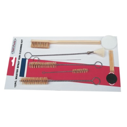 This kit is designed for cleaning various types of spray guns, including suction, gravity feed, HVLP, touch-up, detailing, and pressure spray guns, as well as airbrushes and stripping tools. The kit helps in maintaining the spray gun's performance and longevity by ensuring proper cleaning of nozzles and channels. It includes a variety of brushes and needles suitable for use with different paint thinners and cleaning solvents.
