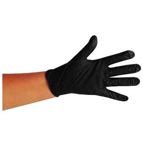 Featuring a micro-textured surface, these black nitrile gloves provide a secure grip and are resistant to most chemicals and solvents. Tough, durable, and latex-free, they are suitable for various industrial applications.