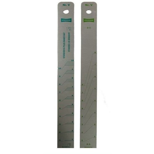 Mixing stick.Front- 2K-HS-Clearcoat - 2:1 2K-HS-HardenerBack- Standohyd Basecoat - 5 / 10% VE-Water